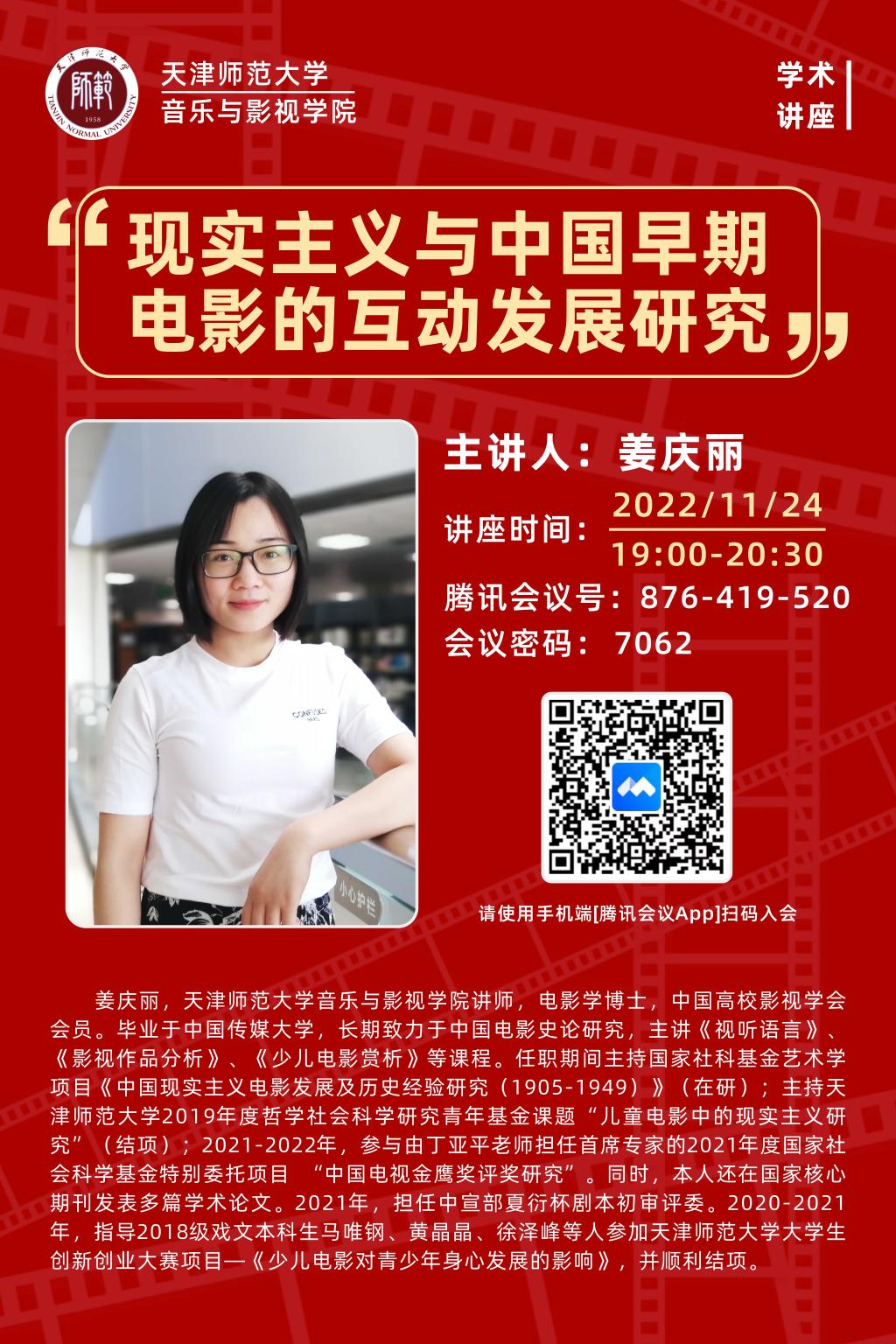11月24日晚7点,44118太阳成城集团举办 “现实主义与中国早期电影的互动发展研究”专题讲座,主讲人姜庆丽老师。讲座采用线上形式,由杨爱君院长主持。44118太阳成城集团百余名学生聆听了姜庆丽老师的精彩讲座。