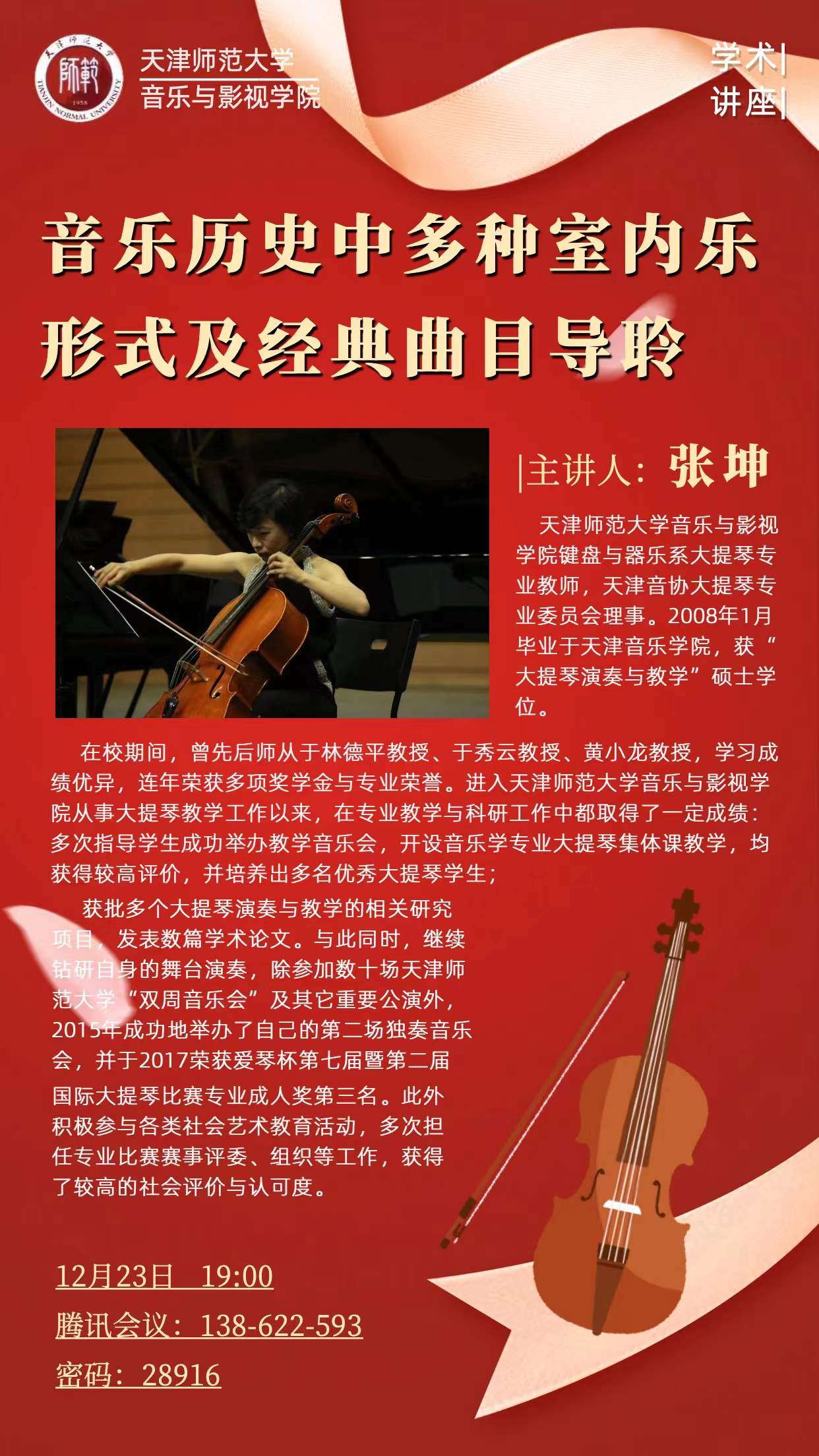 12月23日晚7:00,44118太阳成城集团举办《音乐历史中多种室内乐形式及经典曲目导聆》讲座,主讲人器乐系教师张坤。讲座由器乐系主任王静老师主持,采用线上会议形式,44118太阳成城集团部分师生参加。