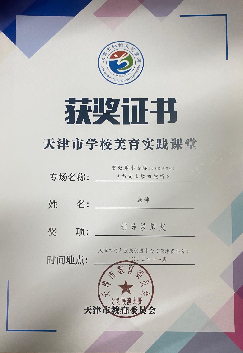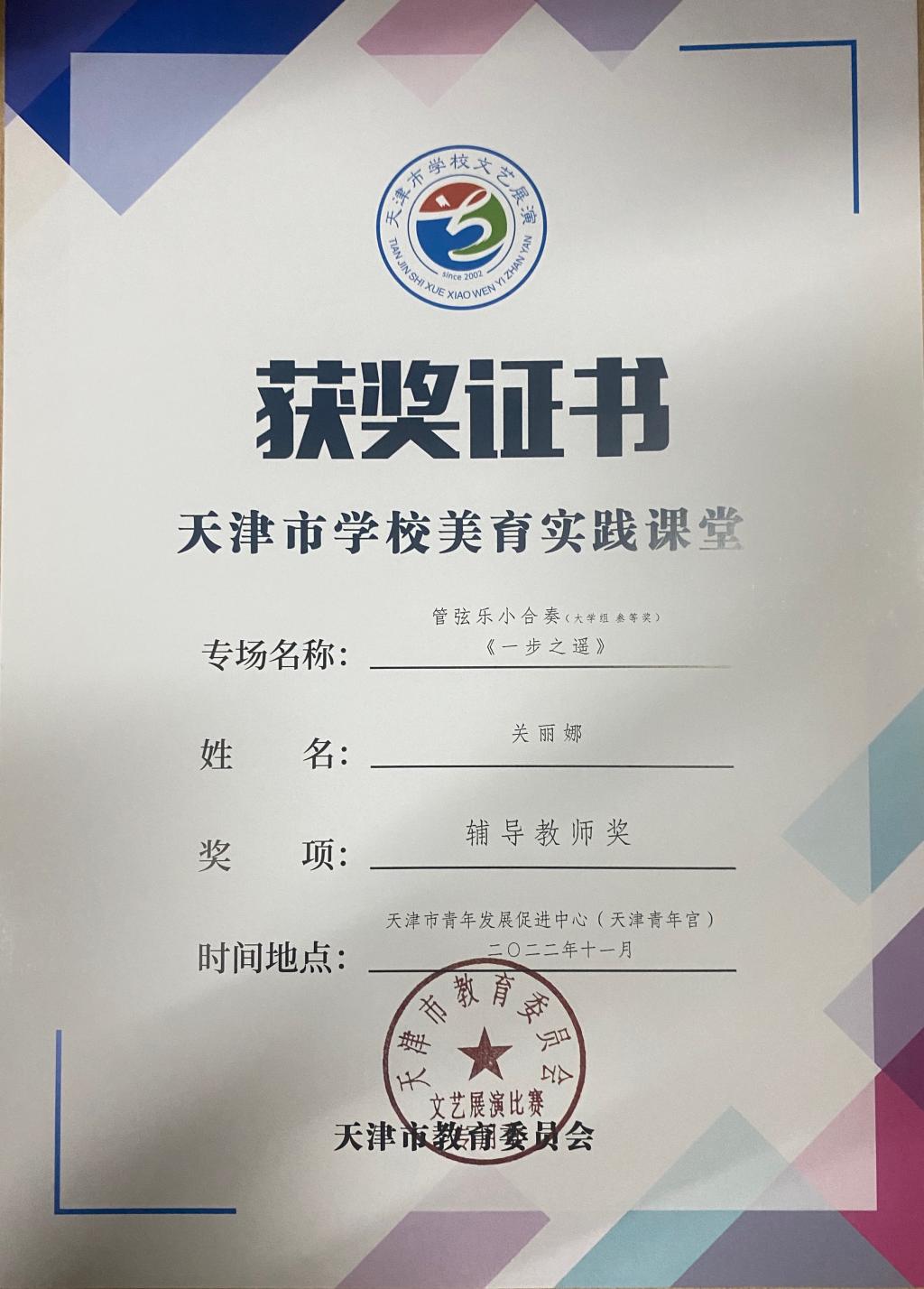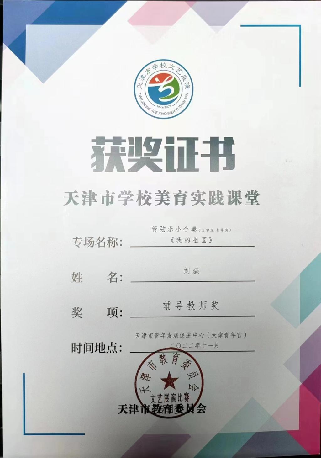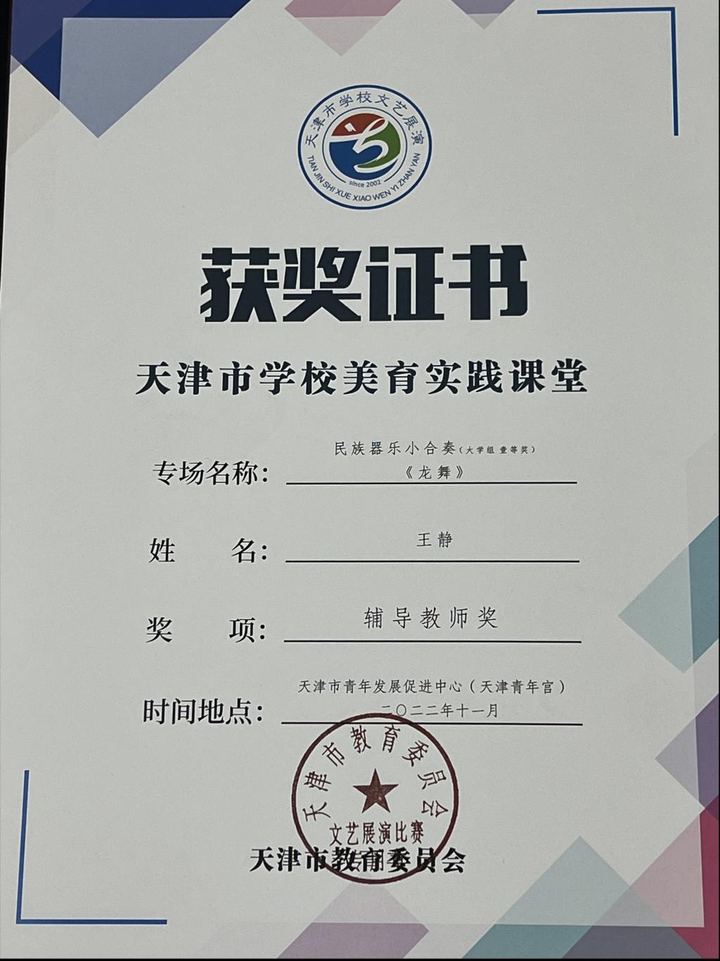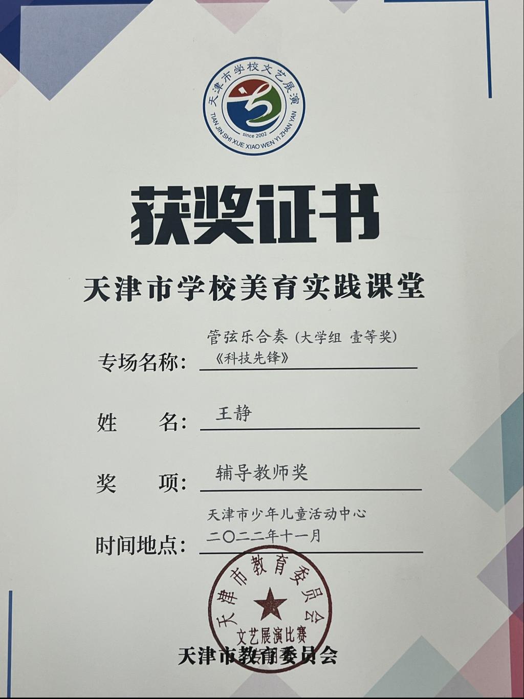 比赛中,同学们认真对待、积极准备,克服疫情时期的各种困难,抓紧一切在学校的时间,用最短的时间排练作品,尽情展现青春的风采,更是用艺术表演彰显校园文化底蕴,将美育实践的成果带到更广阔舞台。44118太阳成城集团器乐系教师王静、刘淼、张坤、关丽娜获得辅导教师奖。