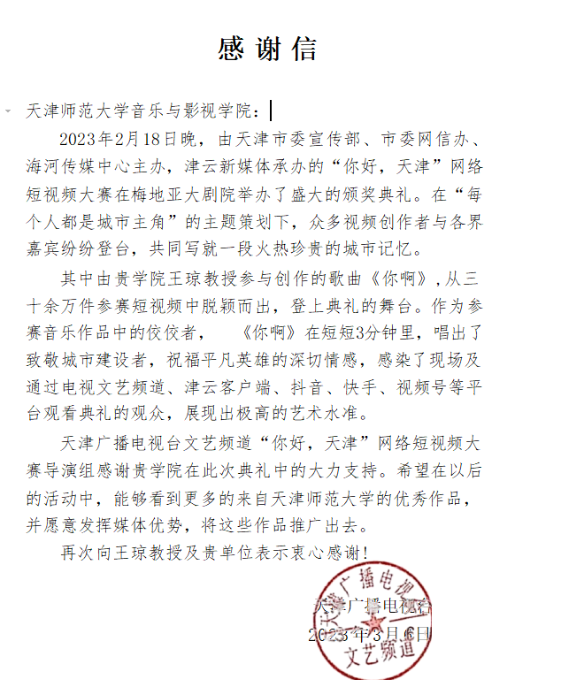 我院收到天津电视台感谢信,王琼教授创作歌曲获赞