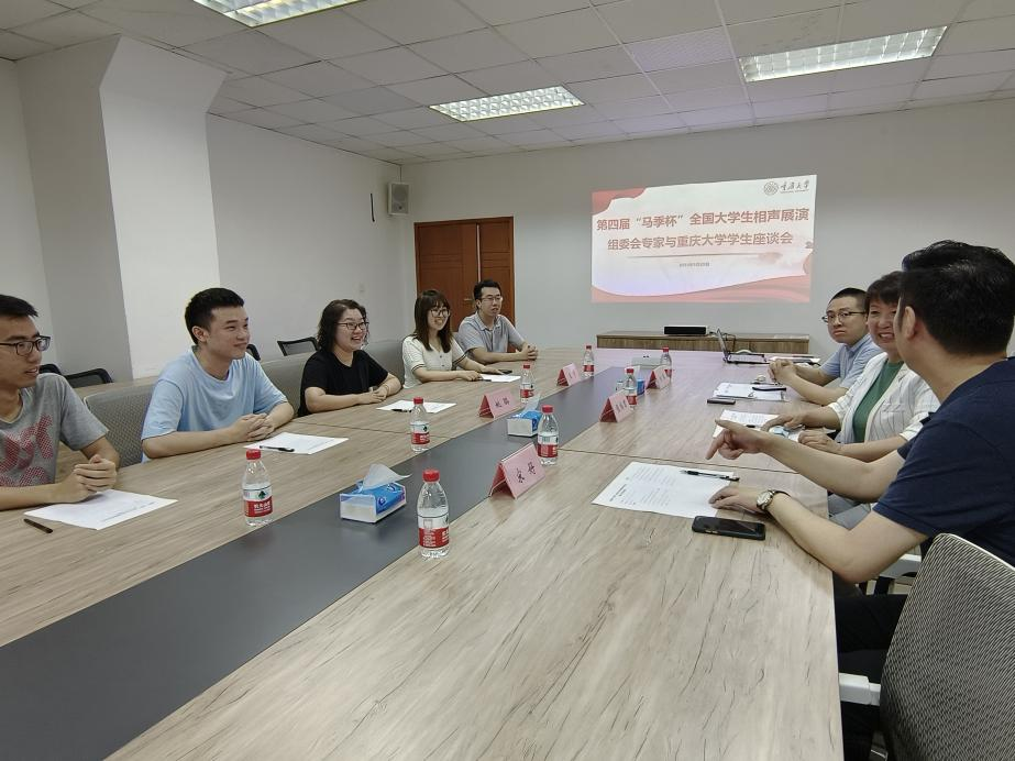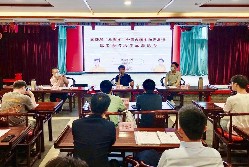 5月27日,征集组同重庆市大学生相声爱好者座谈会在沙坪坝区文化馆剧场进行。重庆市曲协副主席、重庆逗乐坊班主宋好主持座谈会。来自重庆大学、重庆师范大学、四川外国语大学、重庆医科大学、西南大学、重庆科技学院等六所高校的20余名相声社团学生代表参加了座谈会。会上,宋好首先向专家组一行介绍了重庆地区大学生相声传承及社团发展情况,杨皤就第四届“马季杯”全国大学生相声展演作品征集工作向与会大学生进行了解读与说明,张梅君介绍了马季艺术研究会的成立与发展情况,对重庆地区大学生相声的发展与传承给予了充分肯定,并对同学们报名“马季杯”做了动员与号召,并就大学生们提出的作品报送、相声作品创作,社团发展,相声表演技巧等问题做了回答。座谈会现场气氛融洽,高效务实,成效显著,不仅推动了“马季杯”在重庆地区的征集工作,也极大的促进了各高校间相声文化的交流与沟通。