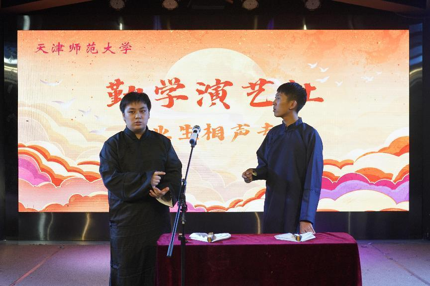 首先外国语学院的韩泰麟和计算机与信息工程学院的林洋,带来相声《学英语》。大学生为找工作准备英语面试,病急乱投医,找来大师学英语。诶,稍等,这位的英语怎么有股早点铺的味道?
