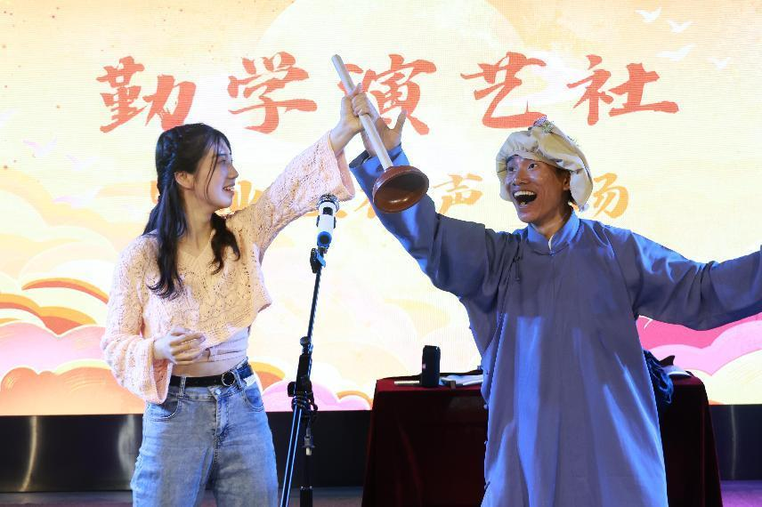软件学院的董杰和地理与环境科学学院的戴志宇,带来相声《犹豫》。且看大学生犹豫不决,没有主见,既吃亏又上当。他最终能否在亲朋好友的帮助下, 反省自己犹豫纠结的坏毛病,变得果断勇敢呢。