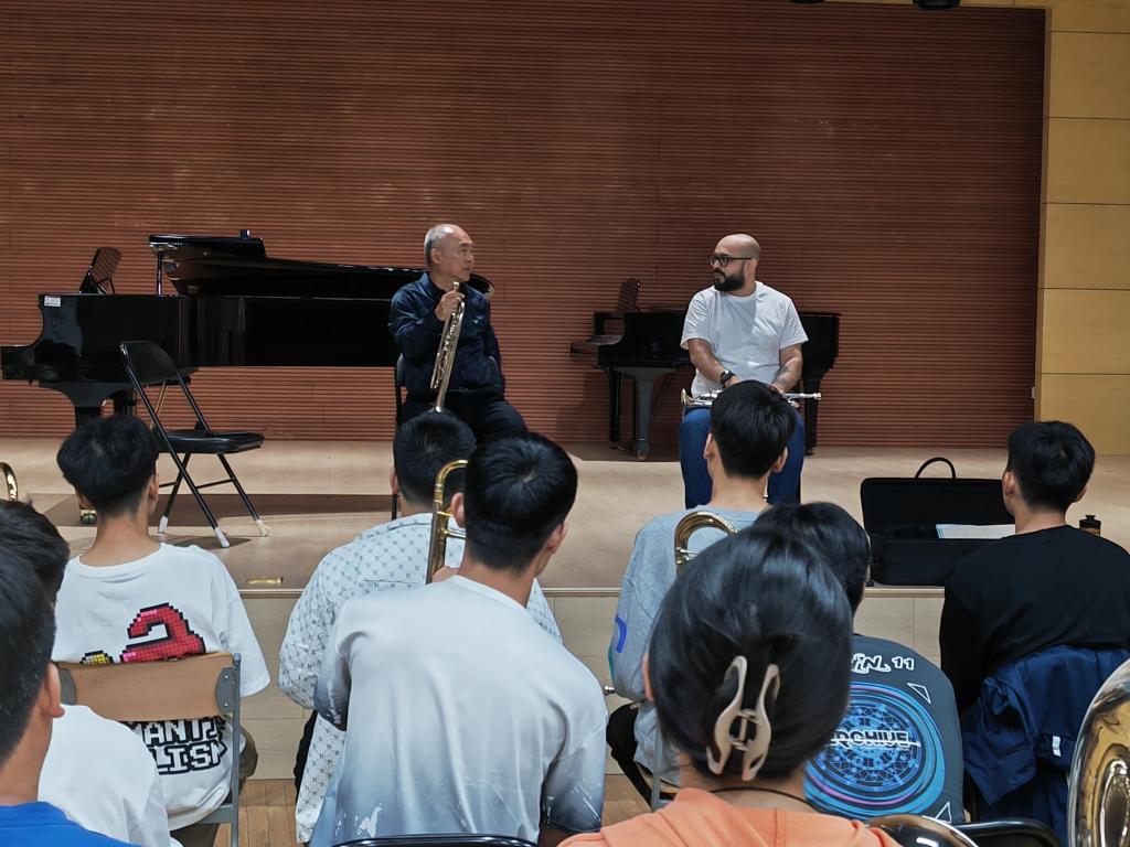 此次大师课分为三部分,第一部分是铜管基本功训练,以铜管重奏训练为主要内容。Jorge Giraldo 通过理论与实践演奏相结合的方式,阐述了他在基本功练习时对气息的运用与理解,并运用号嘴和up sound(小号同阻力号嘴练习器)及乐器交替练习,说明气息在演奏中的重要作用及如何培养学生良好的气息运用。第二部分Jorge Giraldo对现场两名学生进行指导,他对两位同学演奏的音色、音准及准确性和把握性给予肯定,分别对他们演奏的布尔姆练习中的吐音音头及克拉克练习的要点进行了有针对性的指导。第三部分Jorge Giraldo对铜管重奏组演奏的莫扎特《弦乐小夜曲》给予了非常细致的指导,对高低音声部的平稳、声部间的合作、强弱的处理等多方面进行了训练。训练后重奏组同学完整演奏的作品得到了专家的认可及好评。