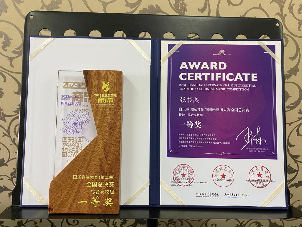 在2023白玉兰国际音乐节国乐竞技大赛活动中,学院2021级打击乐专业学生张书杰发挥出色,最终在全国总决赛中排鼓组取得“综合高校”一等奖的好成绩,王静老师荣获“优秀指导教师”奖。