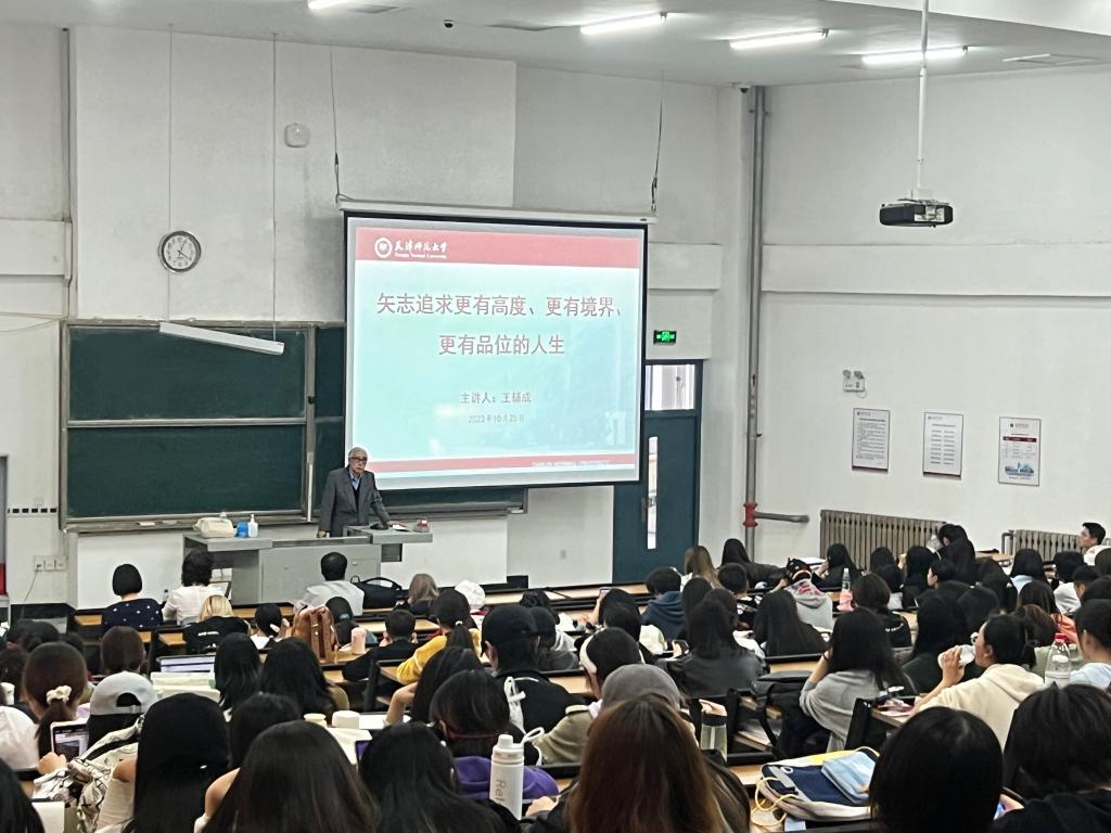王辅成老师结合深入学习贯彻党的二十大精神,以习近平总书记称赞的“新时代最可爱的人”引入主题,选取了古今中外的典型事例,激励同学们树立崇高志向,用个人行动去追求美好高尚的品德。随后从社会、个人两个层面,阐述了“为什么、是什么、如何做”,以达到矢志追求更有高度、更有境界、更有品位的人生。最后,王辅成教授以人生“十观”“六然说”“八不为所”“十思”为例,进一步阐释更有高度、更有境界、更有品位人生的内涵,讲述了“大道至简”的道理,引导同学们“苦学、苦修、苦行”,用实际行动追求更有高度、更有境界、更有品位的人生。