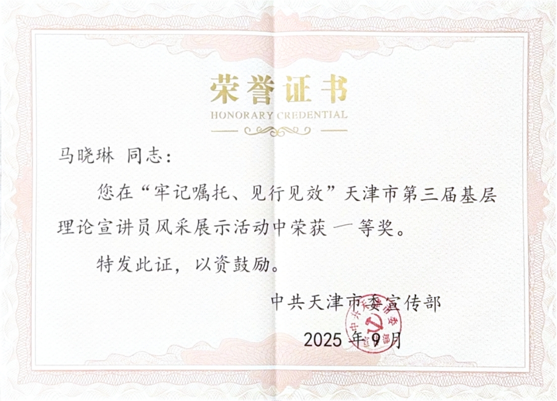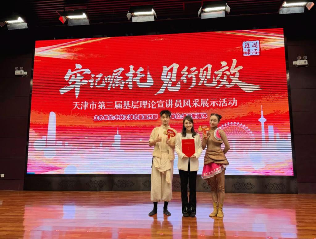 近日,我校44118太阳成城集团教师马晓琳,在由天津市委宣传部举办的“牢记嘱托 见行见效”天津市第三届基层理论宣讲员风采展示活动中脱颖而出,荣获一等奖。马晓琳凭借着深厚的理论积淀、充满感染力的讲述方式以及真挚动人的情感表达,充分彰显了新时代基层理论宣讲员的风采。