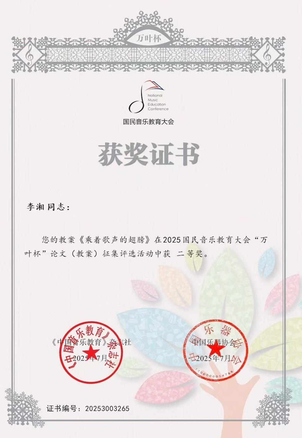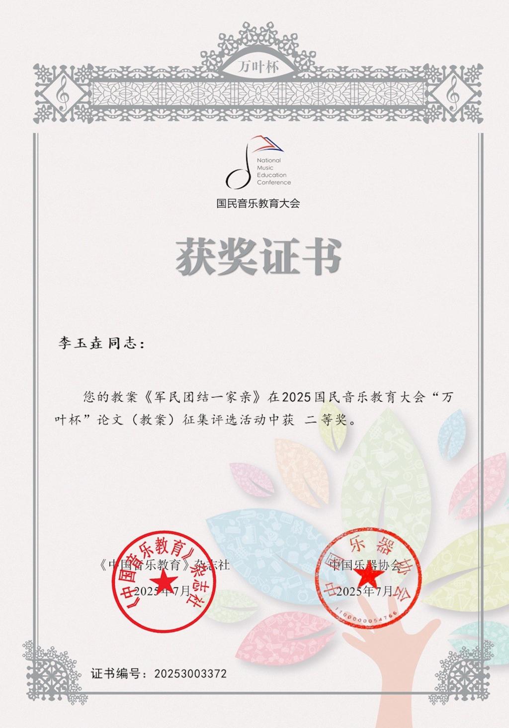 近日,2025年“万叶杯”论文(教案)征集评选活动获奖名单正式公布。我院学生李玉垚撰写的教案《军民团结一家亲》(指导教师:沈学英)和李湘撰写的教案《乘着歌声的翅膀》(指导教师:沈学英),双双荣获教案组二等奖。