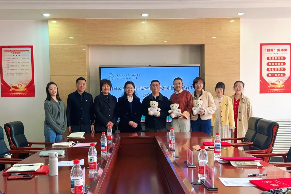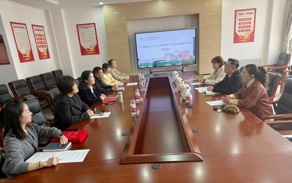 我院副院长颜彬、音乐专业学科带头人刘淼、音乐学系音乐技法教研室主任吴静欣出席本次活动。天津市河西区教师发展中心音乐学科教研员卢馨,天津市梧桐中学党总支书记张树鸾、副校长刘贵镇及学校相关教师代表共同见证了此次签约。