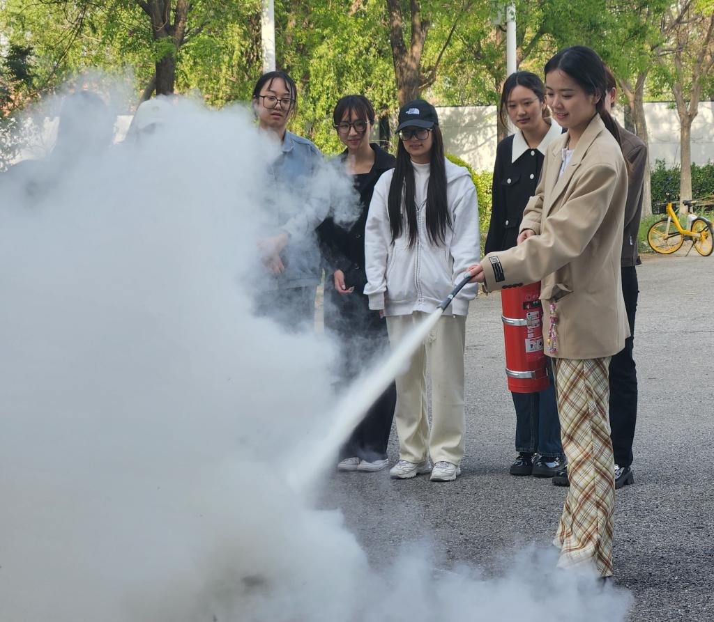 活动第二大板块则是消防安全实践演练。在管理人员和教师组织下,同学们从安全出口有序疏散,并在雅艺楼户外停车场处学习灭火器的使用。