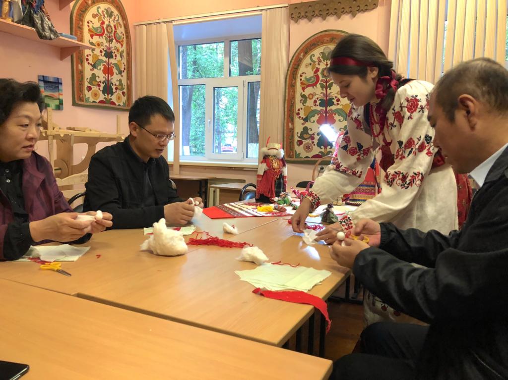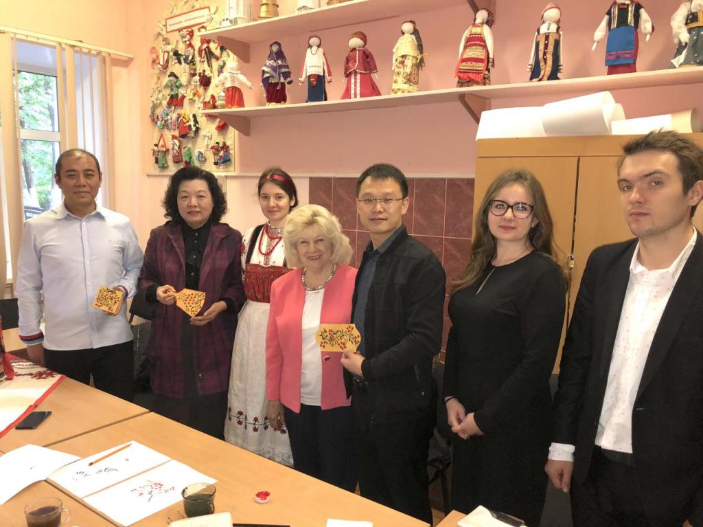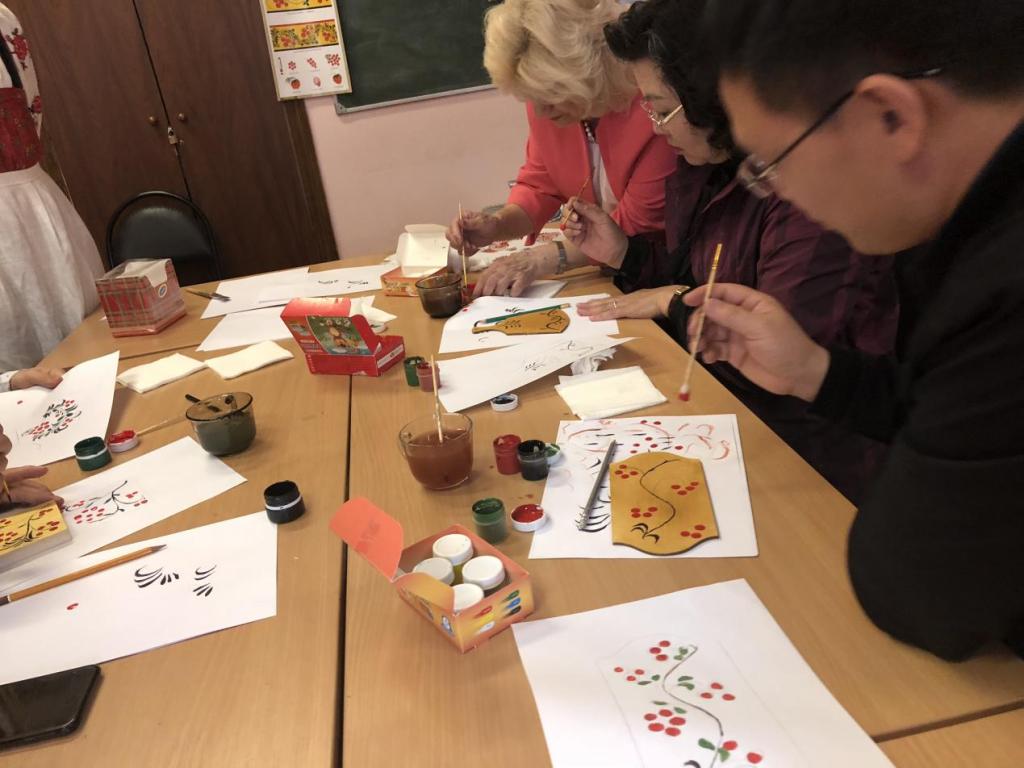 在游览结束时,院领导共同参加了一场制作娃娃 - 护身符的大师班手工课,并了解了霍赫洛马装饰画(在木器上绘制的金底红色或黑色花叶图案的俄罗斯民间艺术)的绘画艺术,在实践中感受到了所谓“草木”画中元素和细节的艺术魅力。